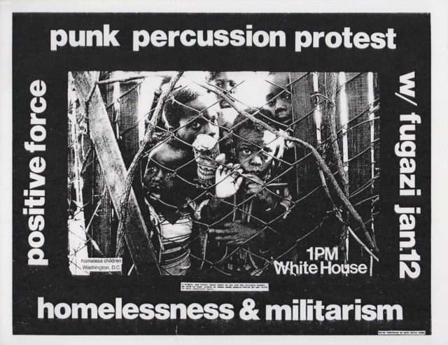 “Este é um flyer que eu fiz para o protesto do Fugazi em parceria com a Positive Force em janeiro de 1991, usando uma poderosa fotografia do Jim Hubbard tirada no Capital City Inn, um motel transformado em abrigo de sem-tetos. Aquilo era um lugar horrível para as famílias viverem – era mais uma espécie de acampamento de refugiados do que um lar – e a foto capturou um pouco do perigo e do desespero daquela atmosfera. A ideia do Ian Mackaye era fazer um show de protesto do lado de fora em pleno inverno. Com isso, ele pretendia atrair a atenção para a quantidade de gente que vivia nas ruas de Washington DC.