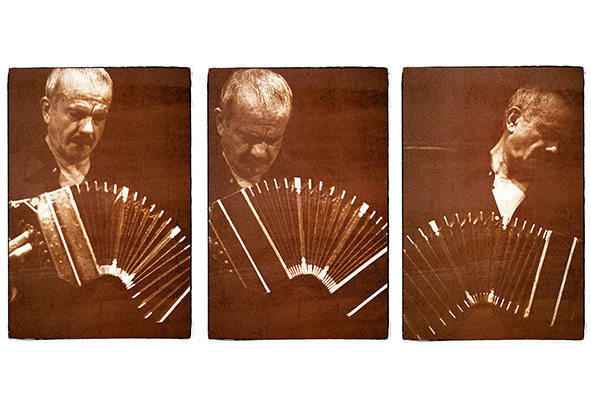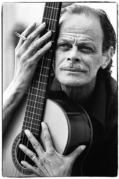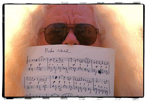 “Ainda nos anos 1980, fui à casa de Hermeto Pascoal fotográfa-lo, no bairro Jabour, próximo à Bangu, na Zona Oeste do Rio de Janeiro. Encontrei-o amassando uma tuba no fundo da casa. Em seguida fomos para a sala, onde se pôs a tocar piano enquanto eu o fotografava. Alternava gestos rápidos sobre as teclas e algumas anotações em uma pauta sobre o piano. Ria e tocava. De repente se levantou, pôs o rascunho de pauta no bolso, caminhou em direção à rua com a tuba amassada e improvisou um pequeno concerto para um grupo de garis. Todos o conheciam, o bruxo de cabelos de fogo. Antes de me despedir, pedi para fazer uma foto de seu rosto segurando a pauta que havia posto no bolso. Ao enquadrá-lo, percebi o nome da composição: “Bebo Você”. Perguntei o que significava. Me disse que a compôs enquanto eu o fotografava, bebendo a minha presença.”